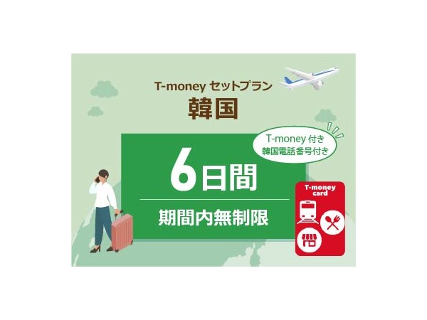韓国 【T-moneyカード】【韓国電話番号】付き- 無制限 / 6日間